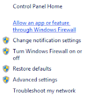 - On the left hand side(L.H.S) select Allow an app or feature through Windows Firewall.