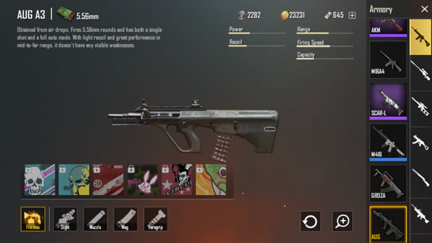 The AUG is the best weapon to spray in medium to long distance in PUBG mobile. Combine it with a 4x or 6x scope it works like charm. It has minimum recoil. If you check the armory section you will find that the recoil of AUG and M416 is similar, but due to the low firing speed of AUG it make it easy to control recoil at medium to long distance.